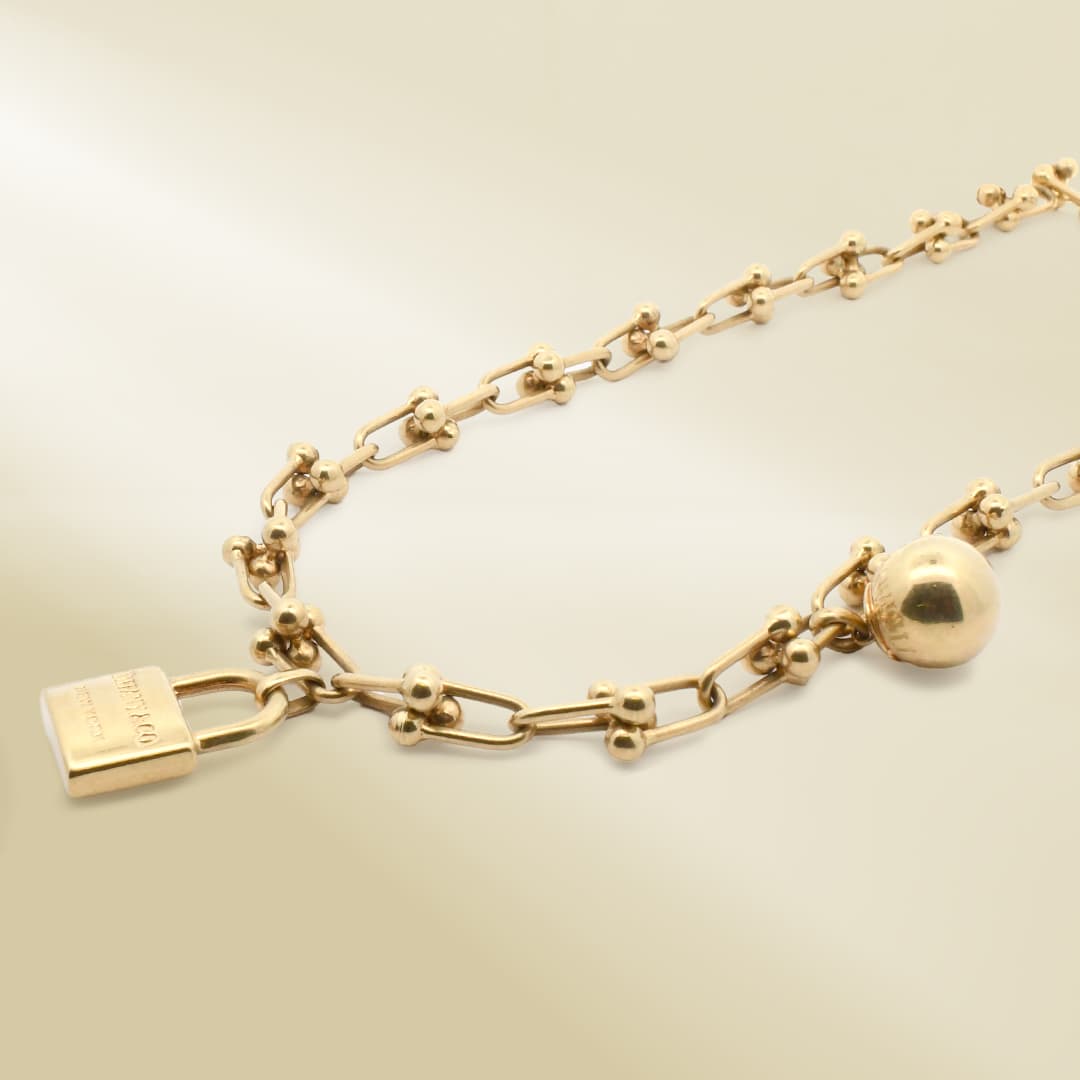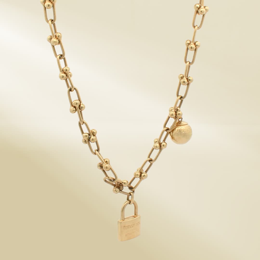 18K Yellow Gold Brand-Inpired Chain Necklace with Ball Dangle and Brand-Inspired Pendant